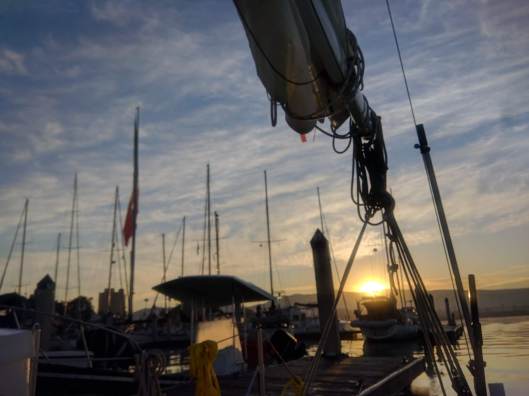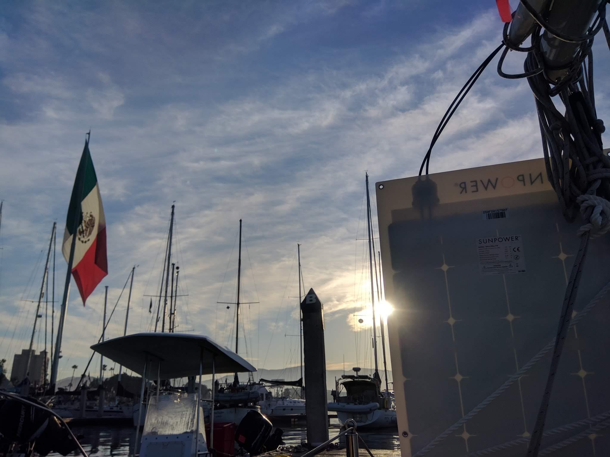 First Dawn in Mexico. Well, actually the second Dawn as I was somewhere off the coast, south of the Coronado islands about 20-miles or so yesterday. More on that later, but it includes zero-visibility fog, electric drive or battery issues, sail damage and near rigging failure, and a rescue by the Mexican Coast Guard!