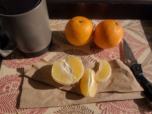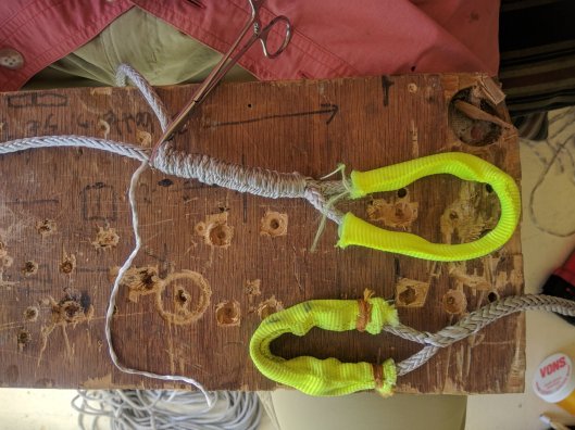 The oranges down here, naranja monte, are more yellow than orange. They have a light taste like watered down orange juice, but otherwise good and the three of them cost 8.08 mxn (.42¢).Another project tackled today was to add a second preventer so that I’ll have one dedicated to port and starboard. They can also be used with the whisker pole and so forth.